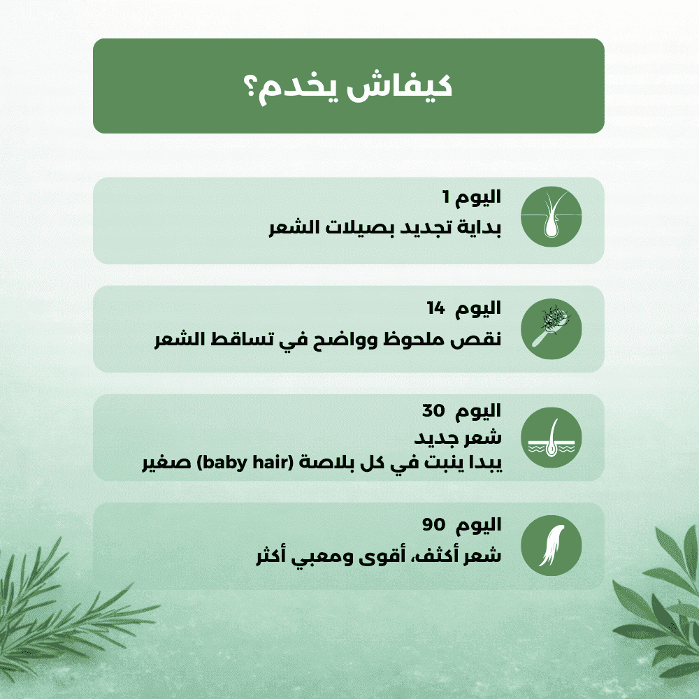 تعمل على تقوية بصيلات الشعر، تغذية فروة الرأس، وتحفيز نمو شعر جديد، مما يقلل من التساقط ويزيد من كثافة الشعر
